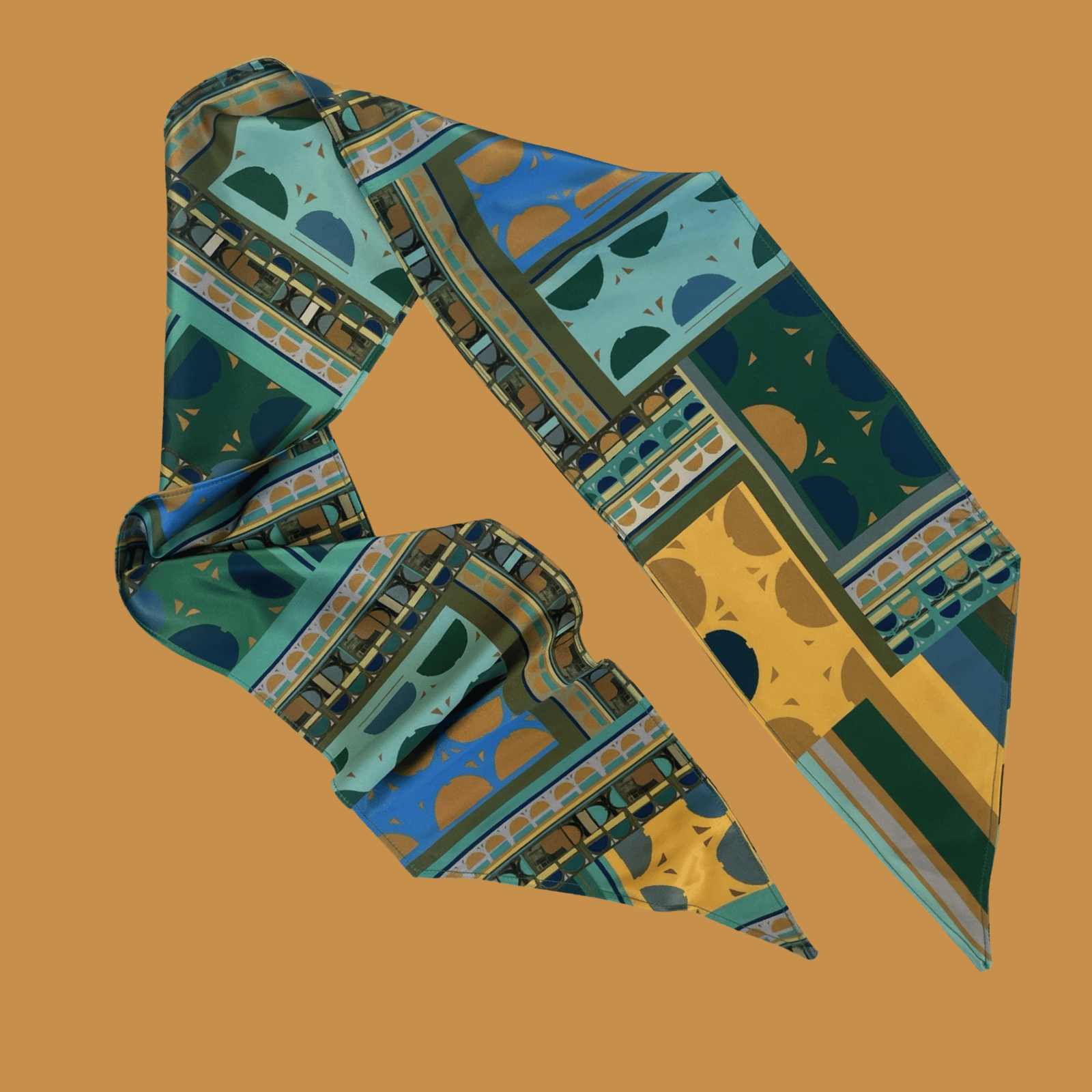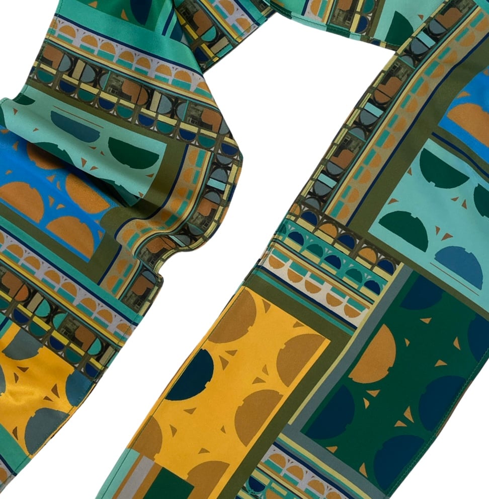 30 x 140cm approx printed onto glossy silk sateen , the scarf is double sided and a nice weight. The design is arranged differently on both sides so the versatility of ways to wear are endless.